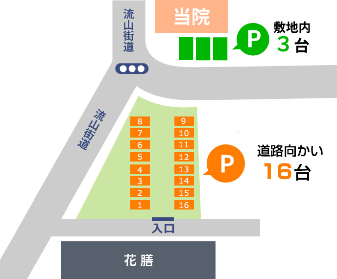 病院前に3台、道路の向かいに16台駐車場がございます詳しくはこちら >
